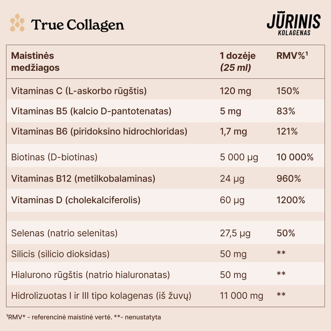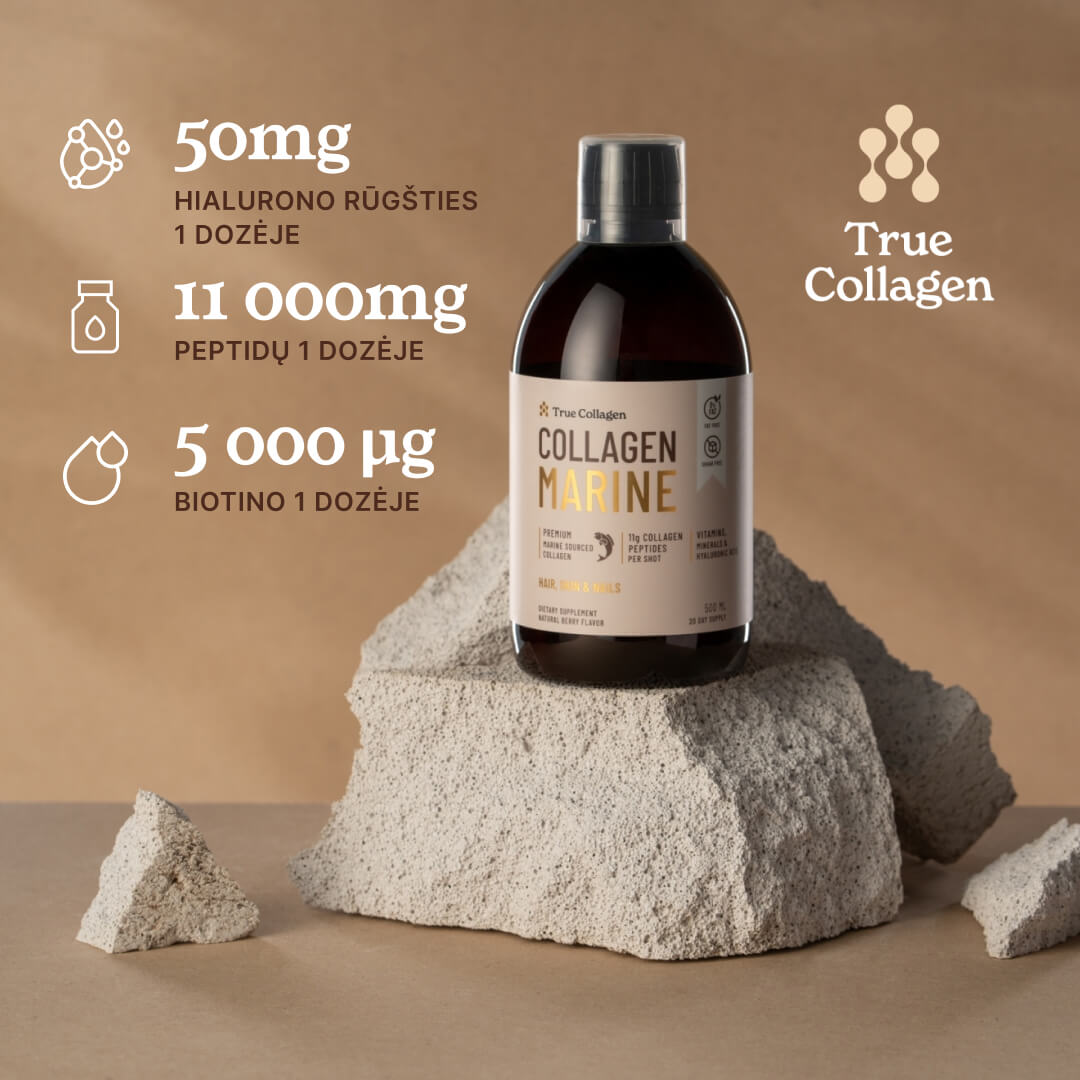 Biotinas padeda palaikyti normalią plaukų būklę (ID 118, 121, 2876), normalią odos būklę (ID 115, 121) ir normalią gleivinių būklę (ID 115). Biotinas taip pat padeda palaikyti normalią energijos apykaitą (ID 114, 117) ir normalią maistinių makromedžiagų apykaitą (ID 113, 114, 117, 4661). True Collagen Marine vienoje 25 ml dozėje yra 5 000 μg biotino (10 000 % rekomenduojamos paros normos).